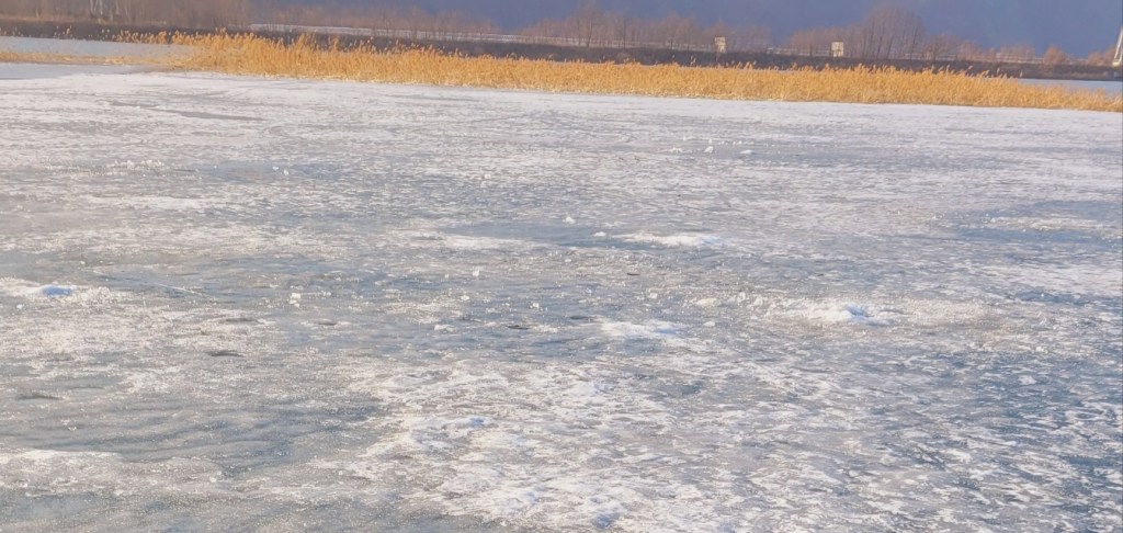 A wide river frozen solid, forming thick layers of ice, is a spectacle in itself.